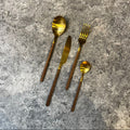 Set includes dinner spoon, dinner fork, table knife, and tea spoon